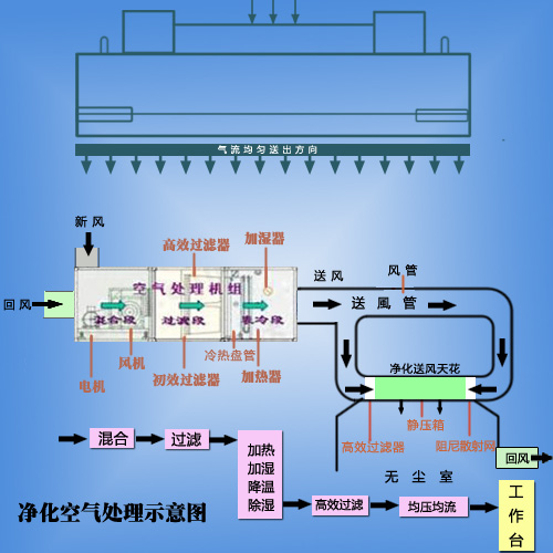 外氣先通過(guò)MAU(外氣進(jìn)行首次過(guò)濾)進(jìn)入無(wú)塵室頂部,再通過(guò)FFU(二次過(guò)濾)將風(fēng)送進(jìn)無(wú)塵室內(nèi),送下來(lái)的風(fēng)通過(guò)高架地板,再進(jìn)入回風(fēng)箱送到無(wú)塵室頂部。