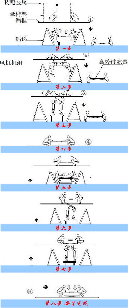 準(zhǔn)備好安裝時所需要使用到的工具,按下圖所示,兩個安裝人員事先登上天花板,打好裝配金屬,腳踏龍骨,雙手扶住懸桁架;兩位安裝人員把FFU平放在桌子上,而高效過濾器事先放在一旁。