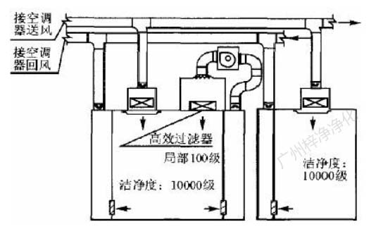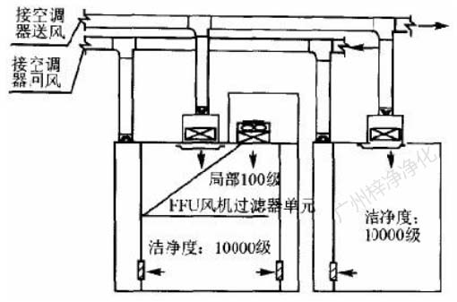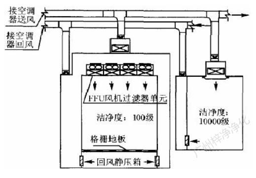 此方式的缺點(diǎn)是設(shè)置循環(huán)風(fēng)機(jī)箱及處理噪聲,需要較大的空間,而通常百級(jí)區(qū)周圍風(fēng)管都比較密集,需要精心布局。此方式百級(jí)區(qū)上部靜 壓箱相對(duì)百級(jí)區(qū)室內(nèi)為正壓,頂棚高效過(guò)濾器與吊架間的滲漏,為靜壓箱流向室內(nèi),直接影響百級(jí)區(qū)潔凈度。對(duì)施工質(zhì)量要求較高。(具 體可參考: