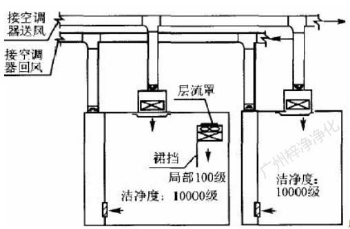 為了提高局部百級(jí)區(qū)氣流垂直層流效果,可以根據(jù)現(xiàn)場(chǎng)工藝設(shè)備高度及操作要求,適當(dāng)降低局部百級(jí)區(qū)吊頂,或在潔凈區(qū)吊頂下直接拼裝 百級(jí)層流罩,并在百級(jí)區(qū)邊界處裝抗靜電塑料裙擋,如圖5。