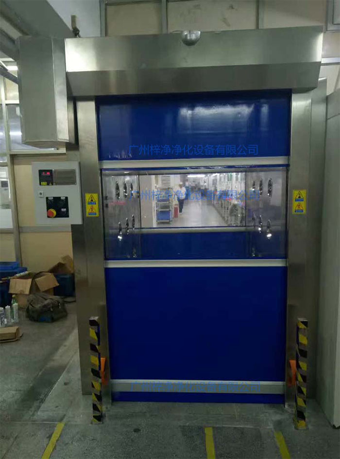快速卷簾門貨淋室主要是方便推車、輸送帶傳遞物料時實現自動化控制、除塵的空氣凈化設備,快速卷簾門貨淋室前門和后門設置為互鎖狀態(tài)。快速卷簾門前門后門示意圖